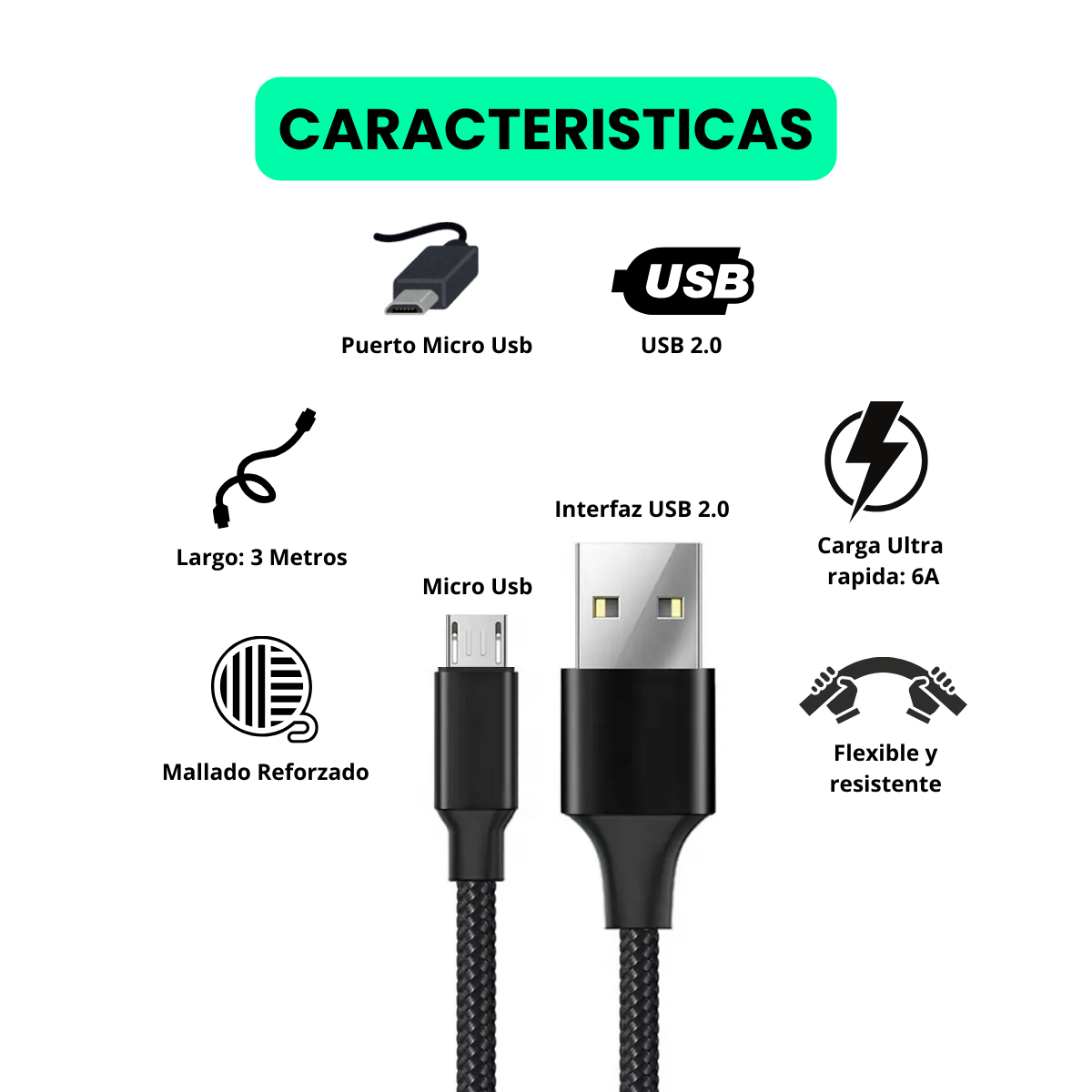 Descubre el Cable Micro Usb de carga ultra rapida, diseñado para cargar a 6A. Con 3 metros de largo y construcción mallada reforzada, es ideal para dispositivos Android, tablets, cámaras y más.